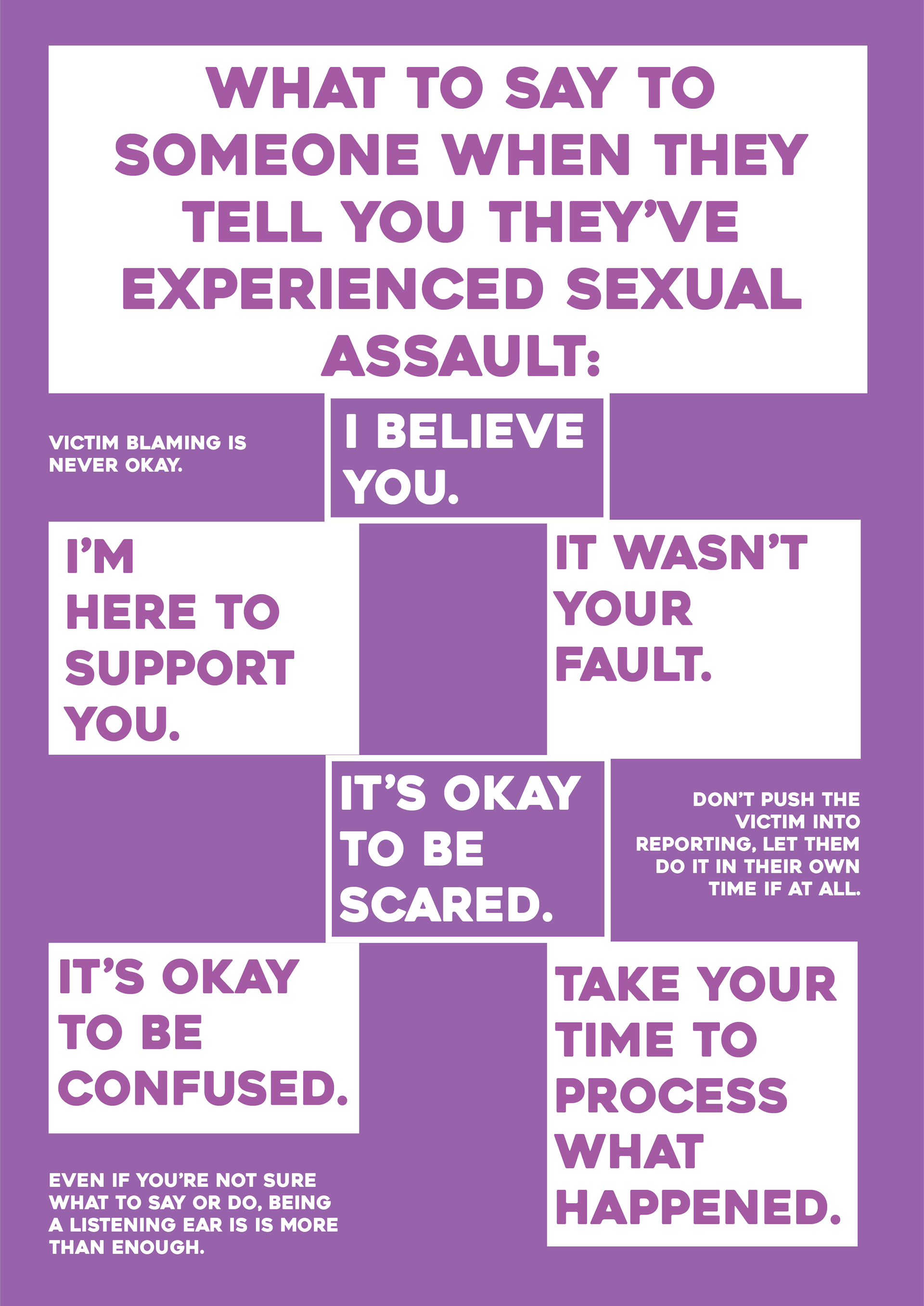 I started this project as my final major project for the end of my graphic design degree. I decided on the subject of sexual assault and consent, following the Sarah Everard and Sabina Nessa murders, which were in the media. As a woman, it was hard to look into those cases, but they made me feel strongly, and I wanted to use my design skills to help educate people on sexual assault, as well as create a social media page that could be a safe place for victims of sexual assault. I had also been seeing more posts on Snapchat ‘exposing’ rapists and abusers from various universities, and wanted to do something, which is how this all started. I know that this project will continue long after university, and I am looking forward to my development, so hopefully this is the first of many projects. I used information from: Brook.org.uk & Plannedparenthood.org